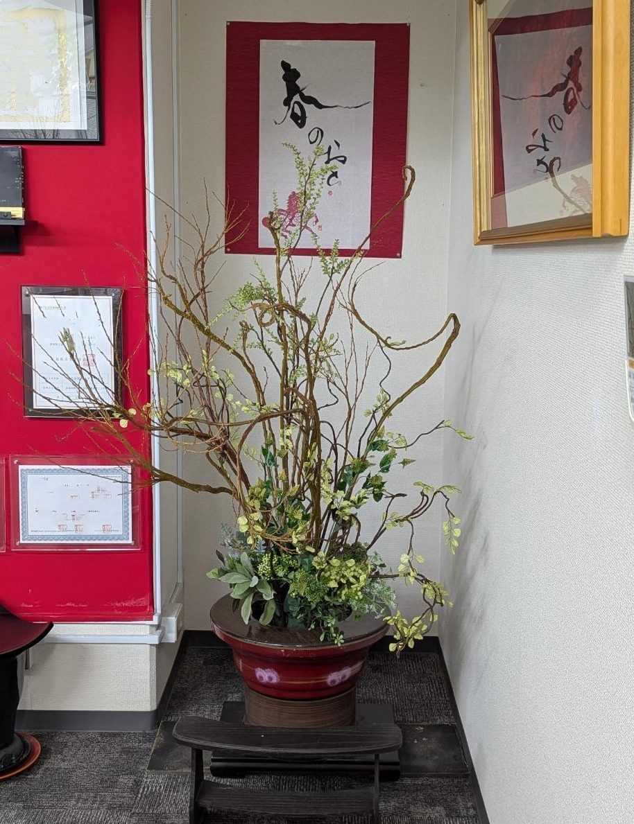 弊社入口正面を飾る「エントランス装花」 に 今年も「石化柳」を使います。
